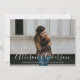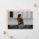 Elegant graduation announcement featuring the graduate's horizontal photo and graduate's name in a white calligraphy script overlay. Personalize the photo graduation announcement by adding the school name and graduation year. The announcement reverses to display a white trellis pattern and blush pink background.