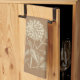 Kitchen towel design features oatmeal tinted vintage Zinnia botanical illustration on brown background.