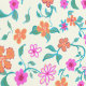 Tiny floral pattern wallpaper. Green stems and leaves with pink and orange flowers on an off-white background.