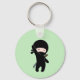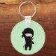Happy cartoon ninja dressed in black with arm raised in waving. Traditional Japanese sword katana can be seen attached over his shoulder.