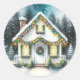 Christmas stickers. Cute little white festive tiny home in the winter forest.