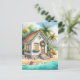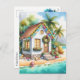 Personalized Christmas postcard. Cute little white festive tiny house on a beach with pretty festive Christmas decorations like wreaths, garland and Christmas lights on palm trees. On the back of the card you can add your own custom holiday message.