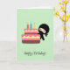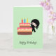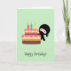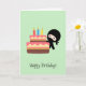 Adorable cartoon ninja dressed all in black is peeking from behind a large layered birthday cake with three colorful candles. Customizable text.