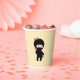 Cute cartoon ninja girl is dressed all in black but for a pink bow on top of her head mask. Traditional Japanese sword katana can be seen attached over her shoulder, it’s handle also coloured pink.