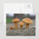 This cute postcard features a beautifully detailed photograph of 4 small yellow toadstools emerging from a log in a park. The background is blurred and the fungi are photographed level so you see the world from their perspective.