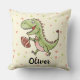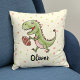 This personalized throw pillow features a cute, whimsical T-Rex sporting a football with small hearts in the background. It is perfect for little football fans. Customize it with your baby's name for a unique touch.