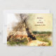 This tipi wedding invitation features a beautiful watercolor teepee set against a scenic background. On the back above the text, there is a boho arrow with hearts and vines.