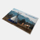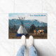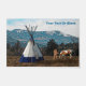 An image of a Native American and his horse near a tipi. Snow has settled on the higher slopes of the mountains in the background. Add your own text.