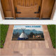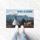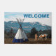 A scene from the Pacific Northwest region of the United States featuring an image of a Native American and his horse near a tipi. Snow has settled on the higher slopes of the mountains in the background. Customizable text reading, "WELCOME" also appears.