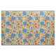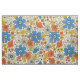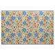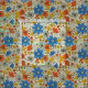 Ce tissu a un motif floral rétro qui présente des fleurs et des feuilles dans les tons orange, bleu et jaune.