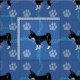 Un mignon chien de chihuahua en noir et blanc contre un arrière - plan bleu avec des empreintes de pattes et des pistes en gris, rose et bleu