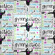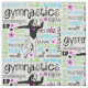 Tissu de typographie de gymnastique. Un bon nombre de mots de gymnastique entourent ce gymnaste adorable. Elle a les étoiles décoratives. Les couleurs sont lumineuses dans rose, bleu, et le vert pour accentuer le noir.