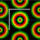 Abstract geometric tie-dye effect circles pattern in red, yellow and green on black