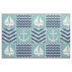 Un motif de carrés turquoise orageux, décoré d'un voilier et d'une ancre blancs, et de carrés bleu marine, agrémentés de chevrons et de vagues bleu pâle, est orné de coutures blanches pour créer une atmosphère nautique classique.