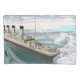Famous Titanic ship floating among icebergs on the water by cloudy day
