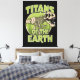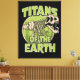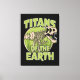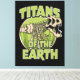 "Titans of the Earth " T-REX - Tyrannosaurus Rex - Fossil funny cartoon logo of the famous dinosaur against a vivid orange background.