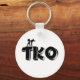 TKO written in Asian style font, black English writing. On the top of the technical knock out initials are the silhouettes of two MMA fighters are sparing, one wearing blue gloves & one red, which are the traditional MMA colours.