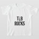 TLB Rocks on front of kids white T-shirt. Back has TLB Ladybug w/Headphones logo.
