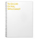 A cheeky spiral notebook with bold yellow text on a clean white background: “To-Do List: Or Not, Who Cares?”. Perfect for anyone who’d rather nap than tick boxes. Productivity is overrated anyway.