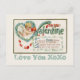 A loving, blonde-haired Cupid, surrounded by a large, blue floral heart, is holding a small, red heart. Greeting: To My Valentine - Love You XoXo with an old-fashioned Valentine message. Image of Vintage Valentine Postcard on a custom off-white background.