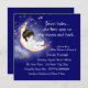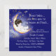 Sweet baby moon and stars we love you to the moon and back baby boy shower invitations. This elegant night time moon and stars baby boy shower invitation is easily customized for your event. You can add your event details in the font style and wording of your choice, as well as change the background colour to whatever you prefer.