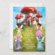 A fairy princess themed girls Birthday invitation template. The magical design features a vibrant red toadstool castle surrounded by rainbow colored fairy princesses with magic sparks. Personalize by editing the digital or printed invite with your unique event details.