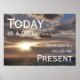 Today is a gift, that's why it's called the present. Wake up each morning with an inspirational motivational decor landscape with self help quote. Scenic vertical landscape of a dramatic morning sunrise sky, with clouds, and the sunshine peering through cloud cover with an early orange and blue sky over the ocean waves. Bright sunlight with rays of light beam through, horizontal orientation. All Designs Copyright © 2013 www.CuteComfy.com
