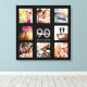 Un cadeau unique de 90ème anniversaire ou de conservation, célébrant sa vie avec un collage de 8 de vos photos. Ajoutez des images de sa famille, de ses amis, de ses animaux de compagnie, de ses loisirs ou de sa destination de voyage de rêve. Personnalisez et ajoutez un nom, 90 ans et une date. Lettres de couleur gris et blanche. Un arrière - plan noir chic. Cette toile est également disponible dans notre boutique avec arrière - plan blanc ou rose couleur or.
