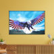 Bald Eagle affiche 4 juillet vient avec un bel Eagle Bald volant dans le ciel avec un drapeau américain dans sa plume sur tout son corps il est dans le ciel avec les nuages derrière lui et une montagne en dessous de lui.Ceci est une belle photo sur cette toile enveloppée