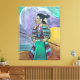 Une femme vêtue de vêtements traditionnels se dresse en profil sur fond de formes abstraites et d'un grand cercle lunaire. Elle apparaît au poing et porte un blouse rayé orné de colliers et d'une jupe de couleur solide, avec une pointe de paysage derrière elle.