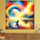 Pièce d'art abstraite d'une silhouette de chat debout, hypnotisée par un spectre de couleurs vives formant un arc-en-ciel et des nuages sur l'eau réfléchie du sol. Des coups de pinceau audacieux et expressifs qui capturent les teintes dynamiques et la scène sereine et puissante.