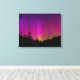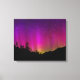 Un magnifique paysage nocturne. Les montagnes et les arbres apparaissent comme une silhouette noire contre un affichage lumineux et vif des aurores boréales scintillant au-dessus. Ce ciel nocturne excitant brille de rose, de violet et de jaune.