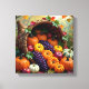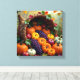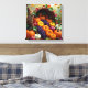 A pretty canvas wall art with a cornucopia full of pumpkins, grapes, apples and surrounded by Fall leaves.
