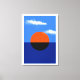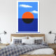 Une oeuvre d'art abstraite d'inspiration Bauhaus audacieuse, avec un coucher de soleil orange vif et noir sur une eau bleue profonde, avec un ciel bleu vif et des nuages blancs doux au-dessus