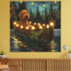 Jetez un coup d'oeil à la magie de la saison des Fêtes avec cette illustration magnifiquement détaillée, montrant un chien fier assis dans un bateau à la décoration festive, glissant à travers un lac serein de Noël. Les lumières scintillantes des pins voisins se reflètent dans l'eau, projetant une lumière chaude et festive qui renforce l'ambiance cosy. Des ornements pendent des côtés du bateau, tandis que des lanternes brillantes éclairent le chemin, créant une scène qui capture l'essence véritable de la chaleur et de la joie de Noël. Cette oeuvre nostalgique apporte une touche de magie de vacances à tout espace, parfait pour ceux qui chérissent l'esprit de la saison.