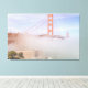 L'emblématique Golden Gate Bridge de San Francisco est partiellement obscurci par une épaisse couche de brouillard. Les tours rouges et les câbles de suspension du pont sont visibles sur fond de ciel bleu pâle. Le brouillard crée un sentiment de mystère et de beauté éthérée, enveloppant le pont et le paysage environnant. Une partie plus petite du pont est visible au loin, également enveloppée de brouillard.