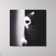 Un curieux chat blanc regarde de derrière un mur avec ses whiskies et sa patte contre un arrière - plan sombre