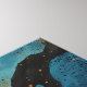 Cette oeuvre représente un paysage désertique avec de grands cactus noirs dressés contre un arrière - plan vibrant et abstrait de chauds lavages d'aquarelle orange et bleu cool. Les cactus sont illustrés dans un style linocut, avec des lignes audacieuses et foncées et une texture détaillée, contrastant avec les couleurs douces et fluides du ciel. Les motifs circulaires, comme des ondulations, de l'arrière - plan suggèrent un effet de soleil ou d'onde de chaleur, ajoutant un intense sentiment de chaleur et de sécheresse à la scène. Des arbres fins et sans feuilles et des détails de terrain désertique fissurés complètent le paysage aride et clairsemé.