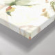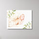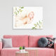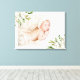 Oeuvre d'art personnalisée sur toile emballée pour la nurserie avec la photo de votre nouveau-né, son nom et ses statistiques de naissance ou autre texte personnalisé. Design féminin élégant avec une bordure florale aquarelle peinte avec des fleurs blanches et un feuillage vert et or. Utilisez les outils de conception pour modifier les polices et les couleurs du texte ou ajouter plus de photos pour créer un cadeau ou un souvenir unique.