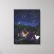 Starry Night art de Traci Van Wagoner imprimer, affiches, accessoires et cadeaux présente notre peinture originale de deux enfants et leur grand chien noir campant sous les étoiles en lisant un livre fantastique autour d'un feu de camp sur des chevaliers et des dragons. La magie de l'histoire tournoie dans le ciel étoilé pour montrer un chevalier et un dragon dans une éternelle danse nocturne des étoiles. Profitez d'un camp d'été en montagne.