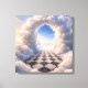 Two clouds form a floating portal leading to a geometric floor in the sky.