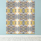 Un motif symétrique présente un mélange de couleurs, dont le gris, le jaune et l'orange, créant un effet kaléidoscopique. La conception répétitive donne un sens de la complexité et du mouvement.