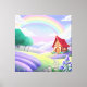 Cette œuvre d'art numérique dépeint un monde de conte de fées rempli d'innocence et de magie. La scène est brillamment éclairée par un arc-en-ciel vaste et aux couleurs douces, qui s'étend au-dessus des collines recouvertes de lavande violette romantique. Une petite maison confortable avec un toit rouge vibrant est nichée dans les collines, avec un chemin de pierre sinueux qui y mène, créant une atmosphère chaleureuse et paisible.