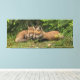 Deux jeunes renards roux sont représentés allongés l'un près de l'autre à l'ombre de conifères.