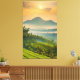 Coucher de soleil sur le paysage tropical indonésien avec montagnes et rizières.