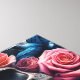 OEuvre d'art complexe avec un crâne magnifiquement détaillé, orné de roses, de plumes et d'un volière vibrant, symbolisant le contraste entre la vie, la mort, la beauté et la transformation dans un arrangement artistique élégant.