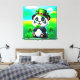 Un adorable panda portant un casquette leprechaun vert et tenant un trèfle à quatre feuilles, entouré de shamrocks dans un champ vert vif. Parfait pour la St. Patrick's Day, l'art animal mignon, ou les dessins festifs !
