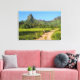 Impression paysage de toile d'une touriste à vélo sur un chemin de terre avec la montagne Rotui dans l'arrière - plan sur l'île tropicale de Moorea, près de Tahiti, en Polynésie française.