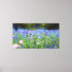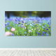 Un champ de fleurs de maïs dans les tons bleu profond et pâle, violet, lavande et rose, avec des feuilles vert pâle.