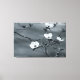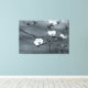 Une photo de fond capture la délicate beauté des fleurs de bois de chien dans une palette monochrome. Quatre fleurs blanches aux centres jaunes proéminents fleurissent gracieusement sur de fines branches, leurs pétales se déplaçant contre un arrière - plan doux et flou. Les branches, ornées de petits feuilles, forment un réseau délicat sur fond gris muet, évoquant un sentiment de tranquillité et d'élégance naturelle.